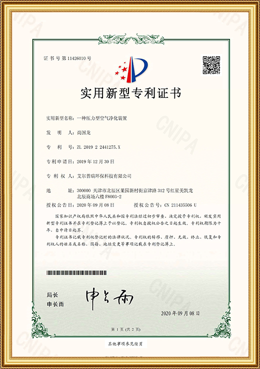 實用新型專利證書(一種空氣凈化產(chǎn)品生產(chǎn)裝置