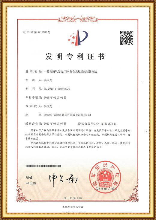 發(fā)明專利證書證書(一種高稿氧化物/Ti02復合光觸